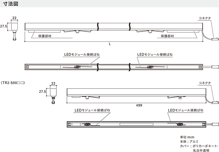 関連キーワード LED間接照明 照明器具 間接光 建築化照明 LED ライト お店用 店舗用 店舗照明ショールーム照明 ディスプレイ照明 光源交換用 コンパクト スクエア 調光 住宅用交換用ランプDNライティング TRIM LINE 交換用LEDモジュール TR2−850 ■特徴 調光兼用型 ハイパワー・コンパクト型 スクエア形状でエッジまでキレイに光る 埋め込み取り付け可能 TR2‐ 1000 WW (例) 1 2 3 1.LEDランプ種別LED照明器具 TRIM LINE TRE2用の交換用モジュール 2.長さ500 850 1000 1250 1500mmの5サイズ実際のランプ長は-1mmです 3.光源色L28=2800K 電球色 Ra83 L30=3000K 電球色 Ra83 WW=3500K 温白色 Ra86 W=4200K 白色 Ra86 N=5000K 昼白色 Ra86 ≪DNライティング TRIM LINE 交換用LEDモジュール TR2≫TR2-850 品番 光源色 色温度 平均演色評価数 全長 管幅 メーカー希望小売価格 単価 定格寿命 TR2-850N 昼白色 5000K Ra86 849mm 22mm 12,500円 8,750円 40,000h TR2-850W 白色 4200K 8,750円 TR2-850WW 温白色 3500K 8,750円 TR2-850L30 電球色 3000K Ra83 8,750円 TR2-850L28 電球色 2800K 8,750円 ※条件により、実際のカラーと異なって見えることがありますので、ご了承ください。